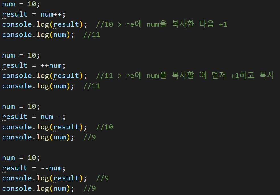 ++ 또는 --로 표현하고, 변수의 앞과 뒤 어느 쪽에 붙이느냐에 따라 연산 순서가 달라진다.