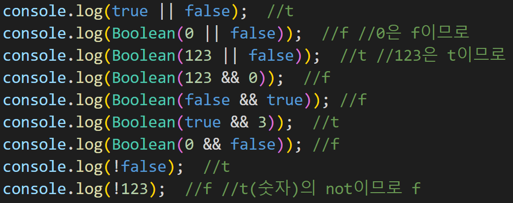 특이한 점은 숫자 0은 false를 의미하고, 그 외의 숫자는 모두 true를 의미한다는 것이다.