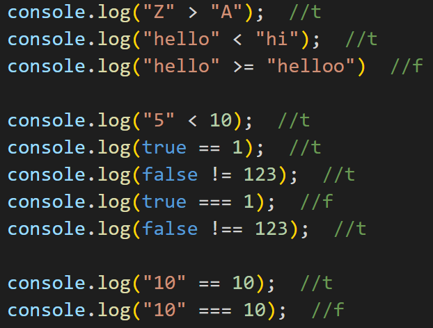 값의 크기를 비교하는 연산자이다. 숫자뿐만 아니라 문자형에도 사용 가능하다. 알파벳 순서이다.