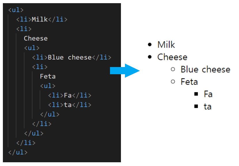unordered list의 약자로 순서가 없는 리스트 생성. 메뉴 버튼을 만들 때 사용.