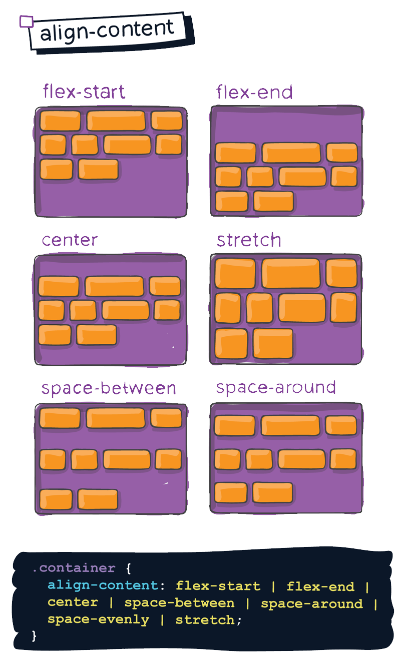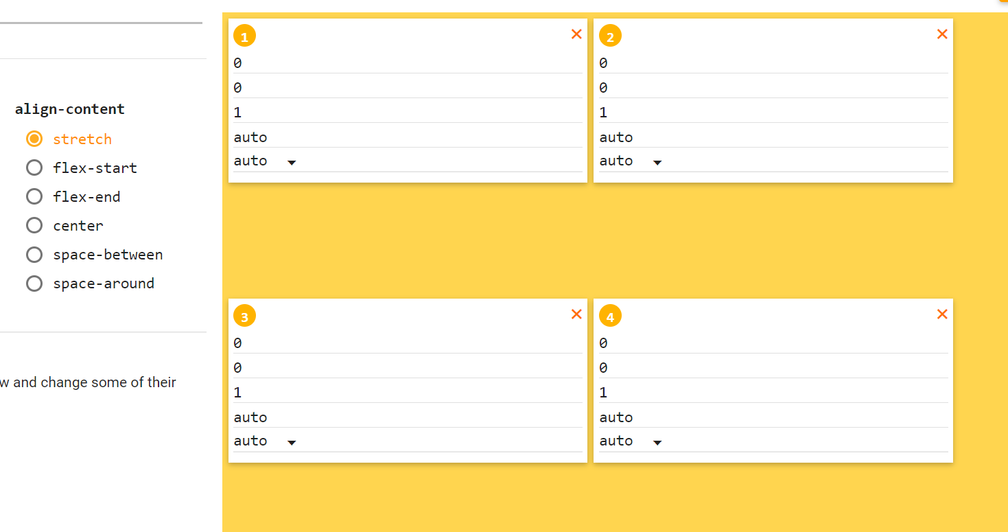 - space-between: 첫 행은 시작점에, 마지막 행은 끝점에 정렬되고 나머지 행은 균등 정렬