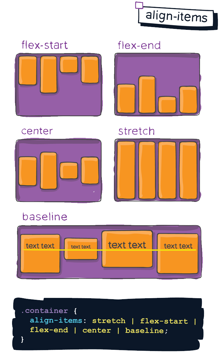 4) align-items: 교차축을 따라 item을 정렬하는 방식을 지정한다.