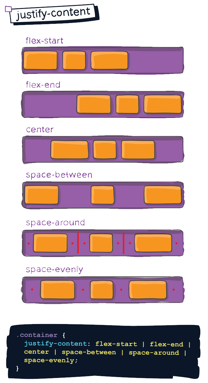 3) justify-content: 주축을 따라 item을 정렬하는 방식을 지정한다.