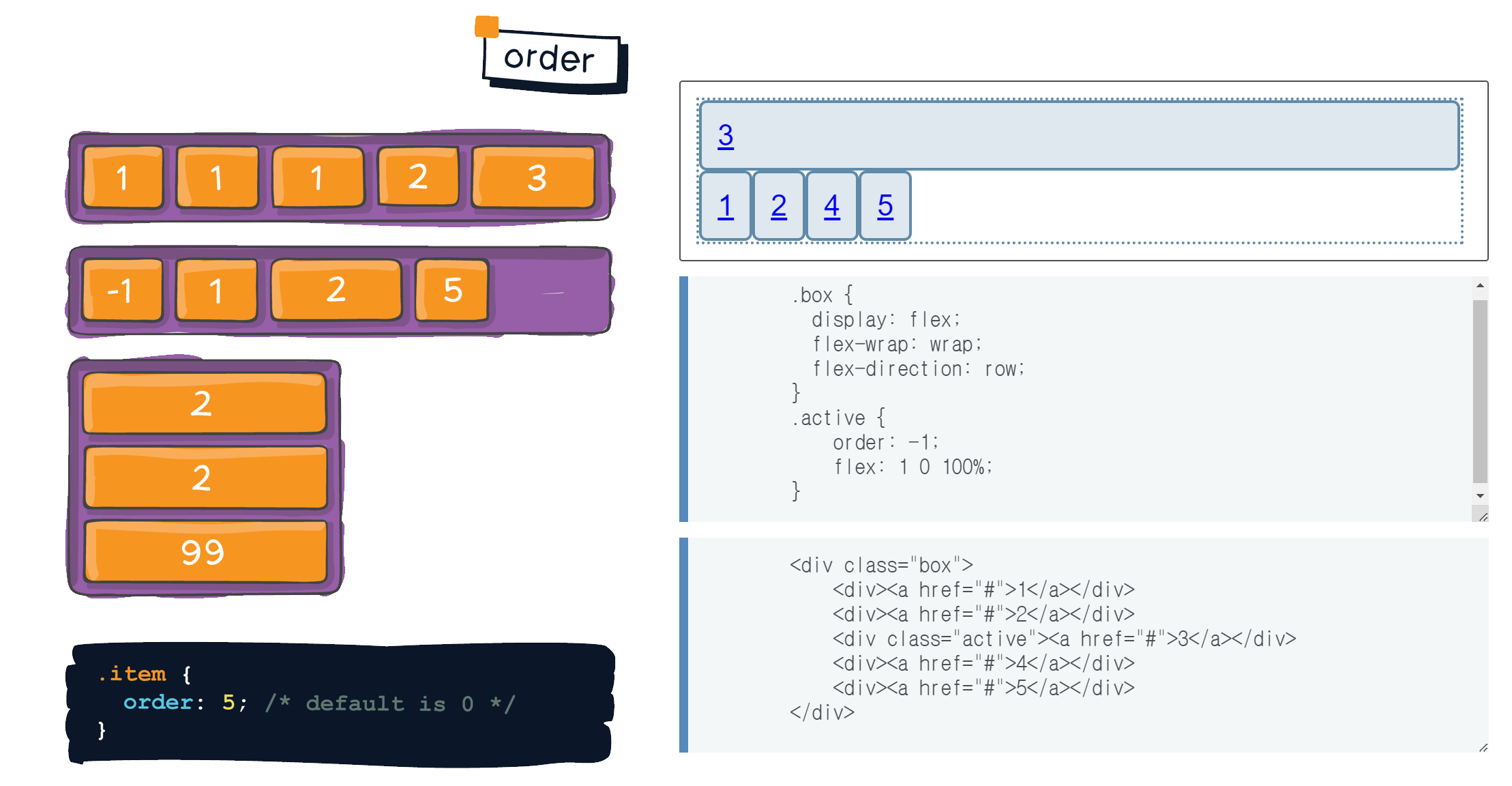 1) order: item의 순서를 할당한다. 숫자가 클수록 뒤쪽으로 밀리며 음수 사용가능하다.