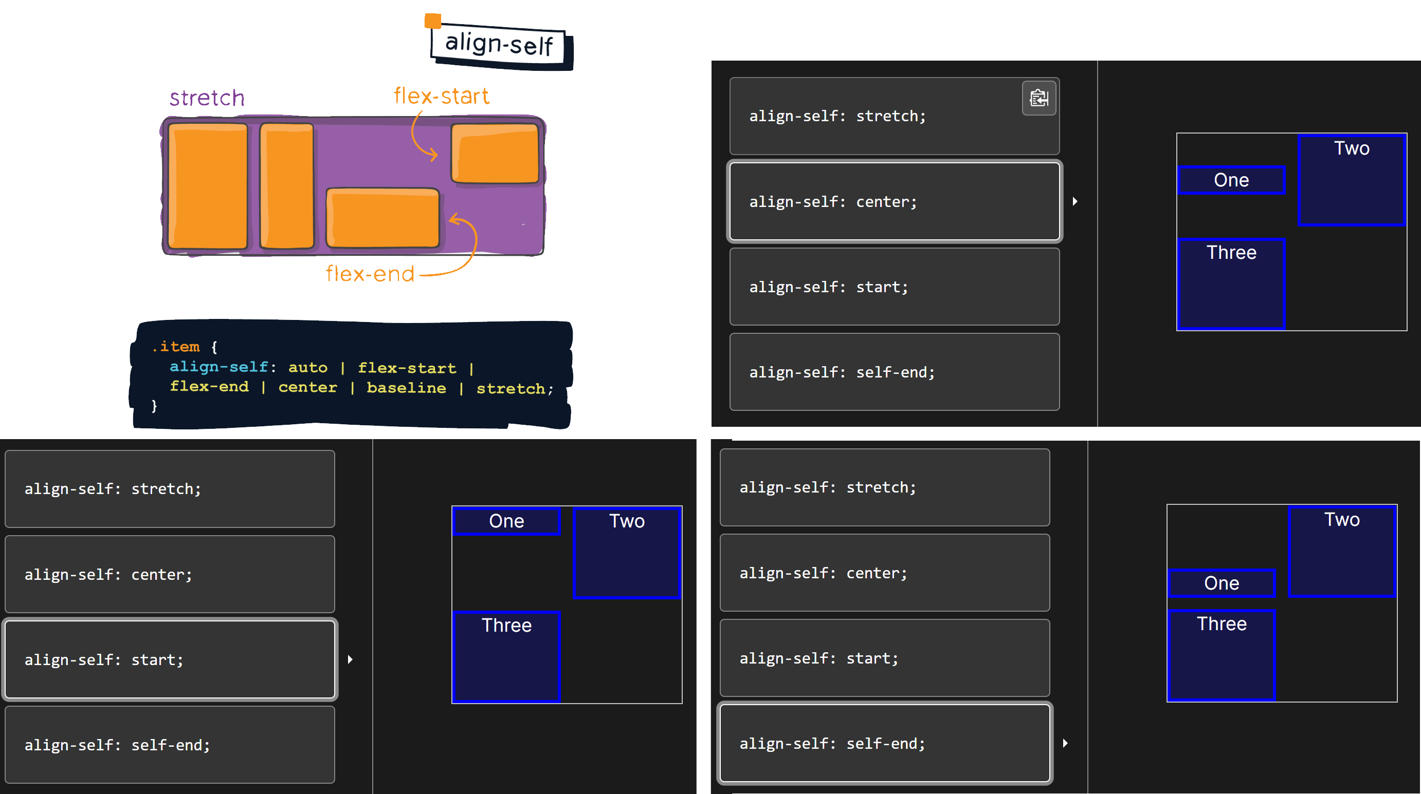 5) align-self: 교차축에서 item 하나의 정렬 방식을 지정한다.