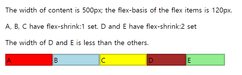 4) flex-shrink: item들의 폭의 합이 컨테이너보다 더 클 때 컨테이너에 맞춰 줄어들 정도를 지정한다.