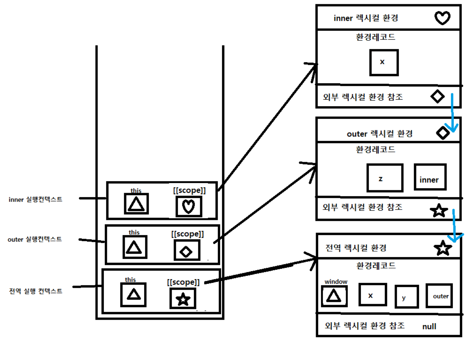 그림처럼 스코프가 중첩된 것을 스코프 체인이라고 한다. inner 함수 안에 y와 z가 없음에도 inner 함수 안에서 출력할 수 있었던 것은 이 스코프 체인을 따라 상위 스코프로 올라가 변수를 탐색했기 때문이다.