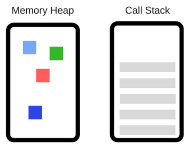 위의 그림은 대다수의 자바스크립트 엔진이 가지고 있는 두 영역이다. 힙heap은 객체가 저장되는 메모리 공간이고, 콜 스택은 실행 컨텍스트가 추가되고 제거되는 곳이다. 콜 스택에 들어오는 코드들은 LIFO(라스트 인 퍼스트 아웃) 순서로 실행되며, 비동기 처리 방식으로 동작하는 몇 가지 함수들을 제외하고는 기본적으로 동기적으로 실행된다.