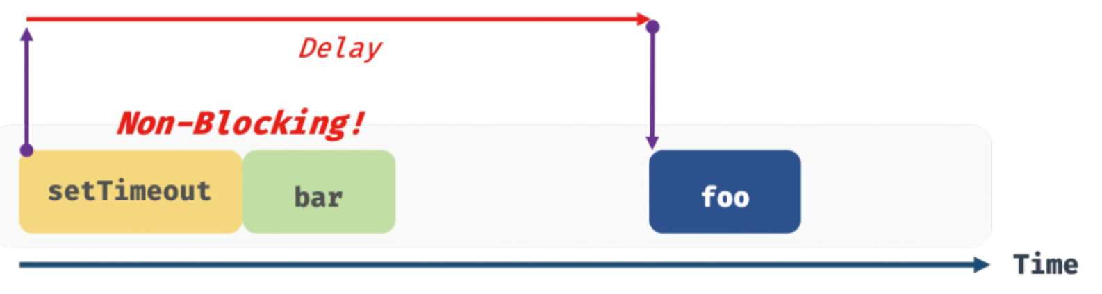위 코드를 실행시키면 어떤 결과가 나올까? setTimeout의 시간이 0초로 설정되었음에도 불구하고 bar가 먼저 출력되고 foo가 나중에 출력된다. setTimeout의 콜백 함수 foo는 무조건 테스크 큐에 저장되고, 콜 스택에 있던 bar가 우선 실행되기 때문이다.