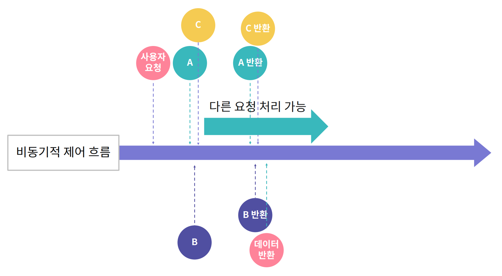 - 비동기적 제어 흐름은 현재 실행 중인 코드가 종료되기 전에 다음 라인의 코드를 실행하는 것을 의미한다.