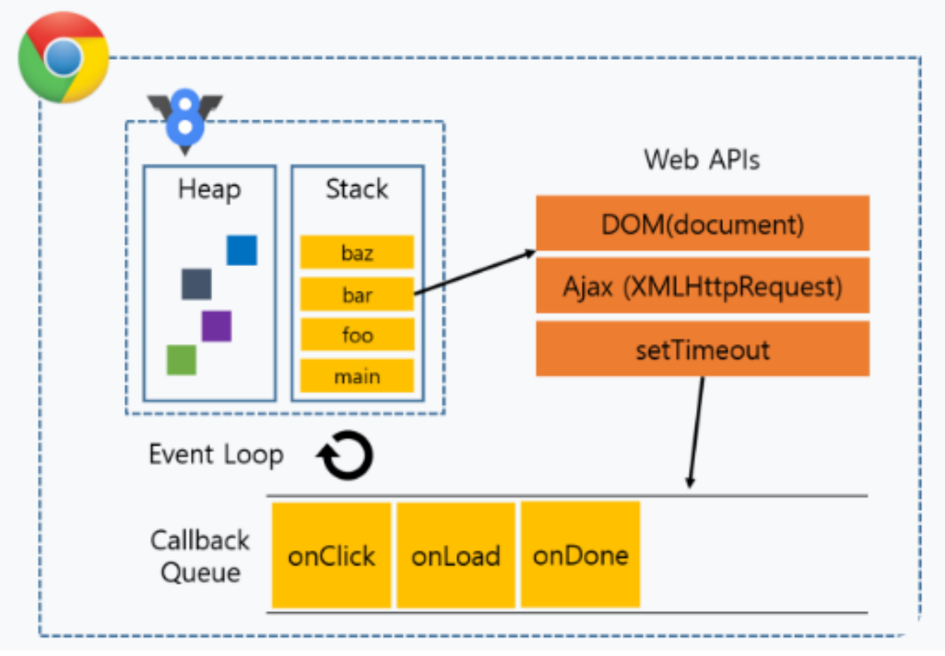 Callback queue는 Task queue라고도 불리는데, setTimeout이나 setInterval과 같은 비동기 함수의 콜백 함수 또는 이벤트 핸들러가 일시적으로 보관되는 영역이다. Event loop는 브라우저에 내장된 기능이다. 이벤트 루프는 콜 스택이 비면 테스크 큐에 대기 중인 함수를 콜 스택으로 이동시킨다.