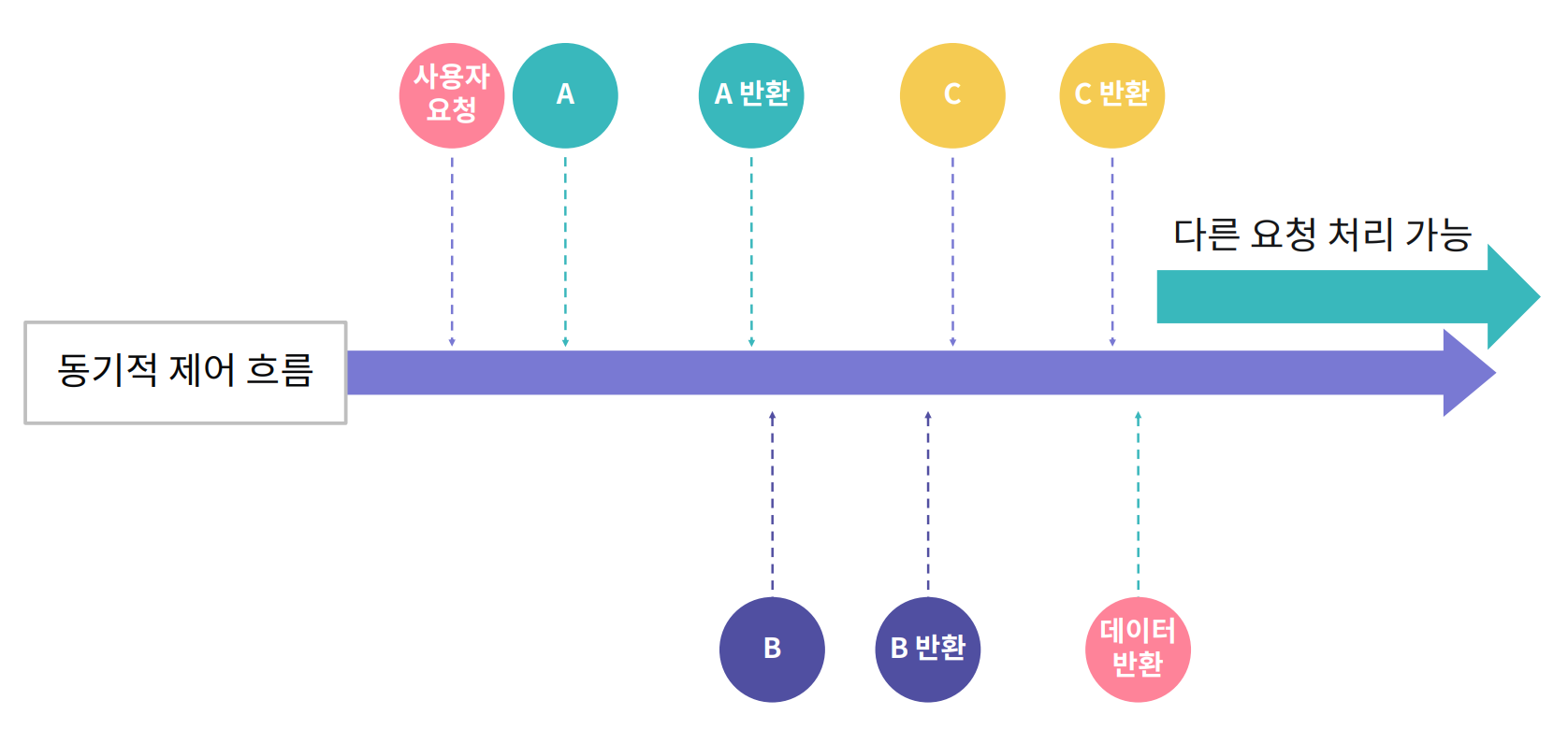 - 동기적 제어 흐름은 현재 실행 중인 코드가 종료되기 전까지 다음 줄의 코드를 실행하지 않는 것을 의미한다.